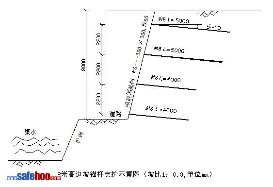 首先要弄清楚邊坡周圍的工程地質條件,對邊壁受力狀態作盡可能的準確分析,對于不同的地質條件和不同的坡比作出不同的具有科學合理的護壁參數的設計方案。下圖為本工程8米高、坡比1:0.3的邊坡噴錨支護示意圖:
