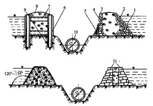 7—槽鋼樁,8—土質堰體:9—滿布銅絲繩:10—管道:11—草(麻)包黏土