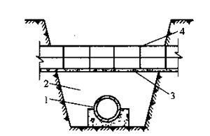 當(dāng)排水管道與其上方的電纜管塊交叉時,宜在電纜管塊基礎(chǔ)以下的溝槽中回填低強度等級的混凝土、石灰土或砌磚.其沿管道方向的長度不應(yīng)小于管塊基礎(chǔ)寬度加300mm,井應(yīng)符合下列規(guī)定。
