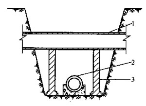 混凝土或鋼筋混凝土預(yù)制圓形管道與其上方鋼管道或鑄鐵管道交叉且同時施工,當(dāng)鋼管道或鑄鐵管道的內(nèi)徑不大于400mm時,宜在混凝土管道兩側(cè)砌筑磚墩支撐,見圖12—7。