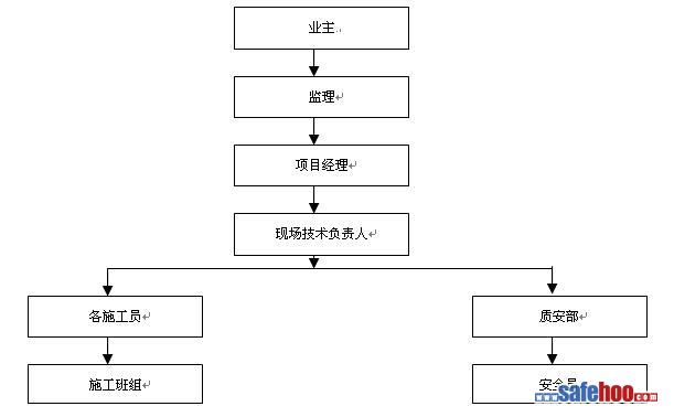 成立以項目經(jīng)理為核心,以專業(yè)主管工程師、專職安全監(jiān)察員為骨干的安全工作領(lǐng)導(dǎo)小組,明確項目經(jīng)理為第一責(zé)任人,對現(xiàn)場施工安全工作負(fù)全面責(zé)任,明確各級人員的安全職責(zé),包括項目經(jīng)理、技術(shù)人員、班組長,專兼職安全員和作業(yè)工人等。安全工作必須落實到人,形成人人講安全,人人管安全,班前講安全,上班查安全的良好風(fēng)氣。制定安全重點防范內(nèi)容,建立安全教育制度,安全檢查制度,安全交底制度和安全事故處理制度,形成一套行之有效的安全保證體系:
