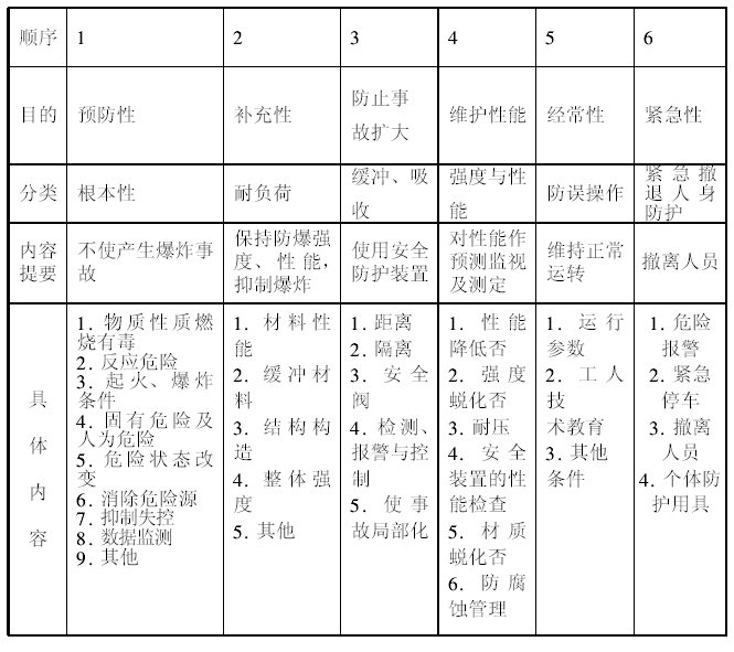 對于爆炸事故危險,必須視其危險程度采取多層次控制原則,以增加其可靠性。一般包括6個層次,即根本的預防性控制、補充性控制、防止事故擴大的預防性控制、維護性能控制、經常性控制以及緊急性控制,詳見下表。
