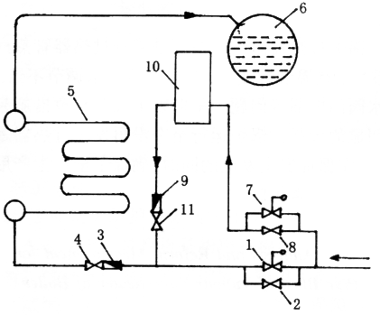 注:1——給水電動(dòng)調(diào)節(jié)閥;2——給水旁通閥;3——逆止閥;4——給水直通閥;5——省煤器;6——汽包;7——減溫水電動(dòng)調(diào)節(jié)閥;8——減溫水旋轉(zhuǎn)調(diào)節(jié)閥;9——逆止閥;10——面式減溫閥;11——減溫器出水閥