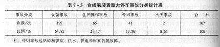 我國70年代引進的大型合成氨裝置,在生產初期曾頻繁發生事故。自1977年至1979年三年間,十一套裝置曾發生人身傷亡事故43次,重大停車事故307次。停車事故中以設備事故最多,停車次數為199次,占事故總數的64.82%。詳見表7—5。???
