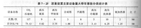 設備重大停車事故269次,按設備類別分類統計,見表7—24。其中,二氧化碳壓縮機發生停車事故117次,位居第一,占設備重大停車事故總數的43.49%。