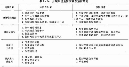 分餾系統是裝置產品外送的系統,在正常操作中主要搞好物料平衡和熱量平衡,操作不穩定將影響產品質量和下游裝置的安全生產。其危險因素及預防措施見表2—64。