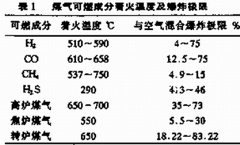 在實際工作中,凡是能夠引起可燃物燃燒的點火能源,我們系統為火源,主要包括明火、高 溫熱源、撞擊火花、靜電放電、電氣火花、雷電放電、化學反應熱等等。要使可燃物燃燒, 火源必須具備一定的溫度和足夠的熱量。現對煤氣可燃成分的著火溫度及爆炸極限進行分析 ,見下表1: