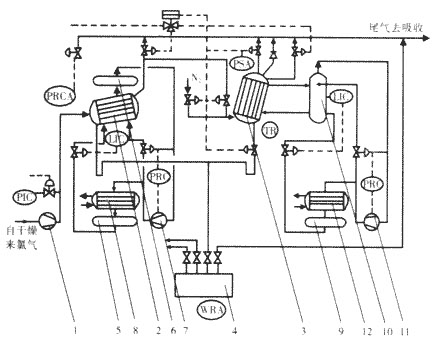 在工廠中低濃度液化尾氣能夠適當(dāng)進(jìn)行處理時(shí),多采用一級(jí)液化流程。如果低濃度液化尾氣處理困難、希望多生產(chǎn)液氯時(shí),多采用二級(jí)液化流程。原料氯氣經(jīng)壓縮加壓至0. 4MPa(表壓)左右后,在第一級(jí)液化器內(nèi)用冷媒(氟里昂或液氨)作冷凍劑,在-20℃下液化。再經(jīng)過第二級(jí)液化器,在-60℃下液化,尾氣用NaOH溶液吸收。由于第一級(jí)液化尾氣中的氫含量已經(jīng)達(dá)到4%~5%,尾氣再進(jìn)入第二級(jí)液化器繼續(xù)液化時(shí),易發(fā)生爆炸。因此,第二級(jí)液化器應(yīng)有足夠的強(qiáng)度,并且要求將第二級(jí)液化器呈60°傾角安裝,尾氣出口設(shè)有防爆膜,一旦發(fā)生爆炸時(shí),防爆膜首先破裂,而將尾氣導(dǎo)入吸收裝置,不至于將第二級(jí)液化器炸壞;同時(shí)第一級(jí)液化器自動(dòng)接通吸收裝置,使第一級(jí)的液化尾氣直接進(jìn)入吸收系統(tǒng),并自動(dòng)功斷第二級(jí)液化器的進(jìn)料,改為通入氮?dú)狻0l(fā)生爆炸后,只要更換防爆膜,第二級(jí)液化器又可以正常使用。