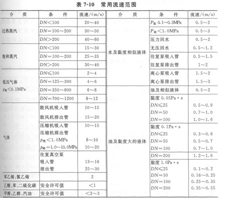 允許壓力降較小的管線,如常壓自流管線,應選用較低流速;允許壓力降較大的管線,可選用較高流速。根據上述原則,可以參照表7—10選取流體流速。