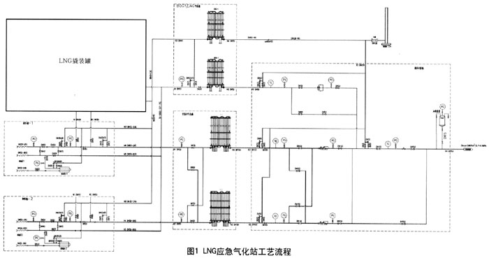 ???在安全供氣的前提下,還必須保證供氣安全,特別是特殊工業用戶,例如:熔鋁、玻璃和爐窯等不能停氣的生產工藝用戶。為此,我司工程技術人員對通常LNG氣化站的工藝設計進行了優化;對卸車、氣化、調壓均采用雙路設計。兩組氣化器、調壓器均相互連通并聯;兩路卸車、兩路氣化器均可以手動切換;兩路調壓在運行中將超壓切斷閥、調壓器設置為高、低兩組,不同開啟壓力與切斷壓力,達到自動切換與切斷,保證了供氣安全。LNG應急氣化站工藝流程如圖1所示。