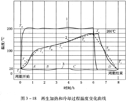 圖3-18為采用兩塔流程的吸附法脫水裝置8h再生周期(包括加熱和冷卻)的溫度變化曲線。曲線1表示再生氣進(jìn)干燥器的溫度TH,曲線2表示加熱和冷卻過(guò)程中離開干燥器的氣體溫度,曲線3則表示濕原料氣溫度。