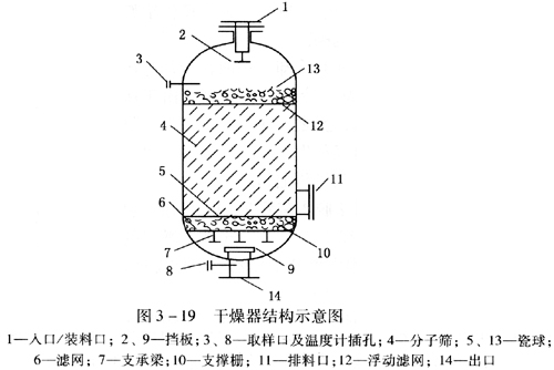 ? ??干燥器的結(jié)構(gòu)見圖3-19。由圖可知,干燥器由床層支承梁和支承柵板、頂部和底部的氣體進(jìn)、出口管嘴和分配器(這是因?yàn)槊撍驮偕謩e是兩股物流從兩個(gè)方向流過(guò)干燥劑床層,故頂部和底部都是氣體進(jìn)、出口)、裝料口、排料口以及取樣口、溫度計(jì)插孔等組成。