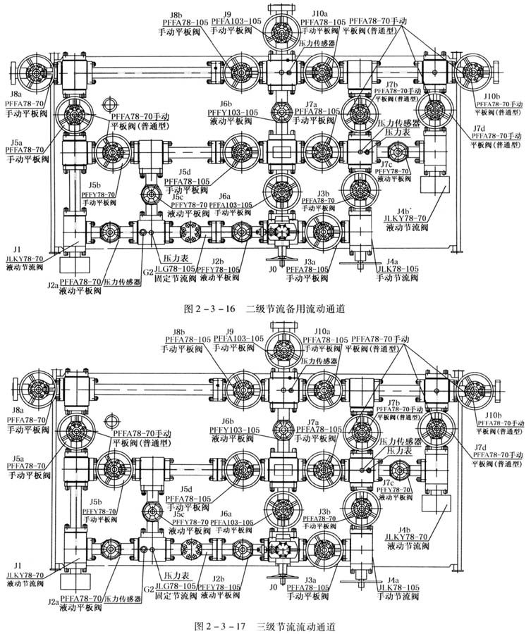 與JG70節(jié)流管匯為代表的常規(guī)節(jié)流管匯相比,新型多級(jí)節(jié)流管匯結(jié)構(gòu)增加了一個(gè)固定節(jié)流閥,一個(gè)液動(dòng)節(jié)流閥;手動(dòng)平板閥也相應(yīng)增加;同時(shí)采用壓力傳感器檢測(cè)和記錄節(jié)流情況,以便隨時(shí)實(shí)施監(jiān)控與智能化控制。見(jiàn)圖2-3-11。