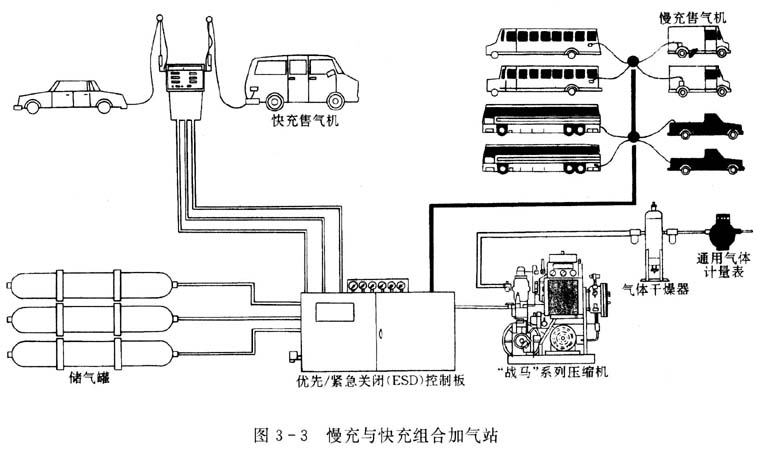 ??? (1) 加氣站技術(shù)?氣體燃料在汽車上的充加需要比液體燃料復(fù)雜得多的加氣設(shè)備,例如CNG加氣站,它不僅需要把天然氣壓縮到20MPa以上,而且還要把供氣速率、容量配置、充放氣優(yōu)先順序、起停控制、計量與環(huán)境補償、安全設(shè)施等各方面做出完善的設(shè)計。而液化天然氣加氣站則更是技術(shù)含量極高的設(shè)備。