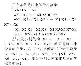 最小割集在事故樹分析法中占有重要的地位,它是引起頂上事件發(fā)生必須的最低限度的割集,即最小割集中任一基本事件不發(fā)生,頂事件一定不會發(fā)生,最小割集的求取方法有行列式法、布爾代數(shù)法等,在實(shí)際分析中常采用布爾代數(shù)法。以下簡要介紹布爾代數(shù)化簡法。