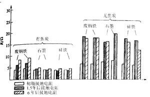 陽極埋地電阻如無焦炭填料,則投入使用后其電阻值會迅速增加,埋在焦炭填料中的陽極則可保持多年無變化。如圖10-38所示。