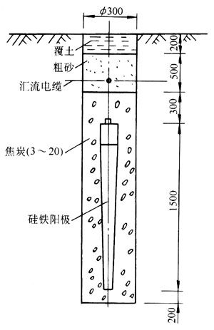 強制電流陰極保護的輔助陽極地床可分為淺埋和深埋兩大類,其方式有立式和水平式兩種。目前國內常用淺埋立式陽極,其結構如圖10-39所示。這種陽極地床的特點是: