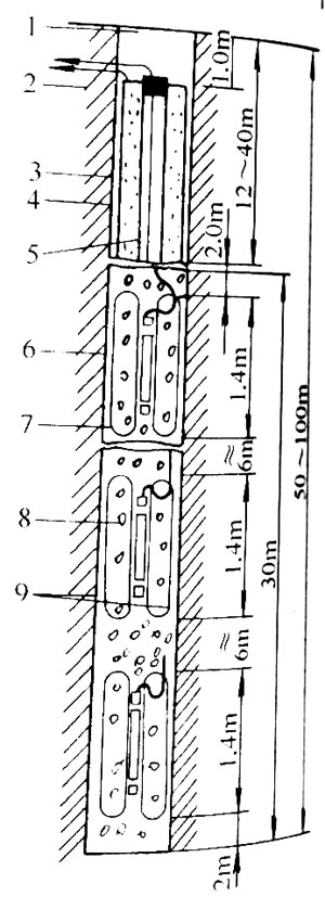 有些場合,由于地理環境、地表土壤電阻率的限制,不宜淺埋地床,而需采用深埋工陽極,如立式深井陽極。這種陽極用于人口稠密地區更好,既可少占地,又可在某種程度上減少對鄰近其他設施的陽極干擾。深井陽極可由單根陽極或多根陽極串聯而成,圖10-41為一種典型的深井地床。