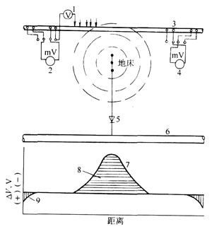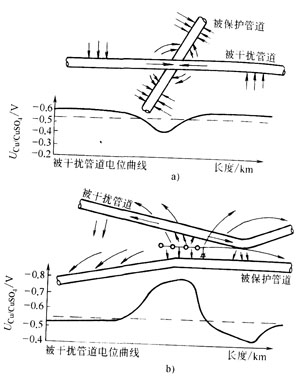 隨著陰極保護(hù)技術(shù)的推廣應(yīng)用,也會(huì)給地下帶來(lái)大量的雜散電流。如近些年來(lái)城市地下燃?xì)夤艿?給水管道、地下電纜等采用了外加電流保護(hù),在它的陽(yáng)極地床附近可能會(huì)造成陽(yáng)極地電場(chǎng)干擾。在被保護(hù)的管道(或電纜)附近可能會(huì)造成陰極電場(chǎng)的干擾。其干擾形式如圖10-62和圖10-63所示。其干擾范圍與陽(yáng)極排放電流和陰極保護(hù)電流密度成正比。當(dāng)單組犧牲陽(yáng)極輸出電流大于100mA時(shí),也應(yīng)注意其干擾。