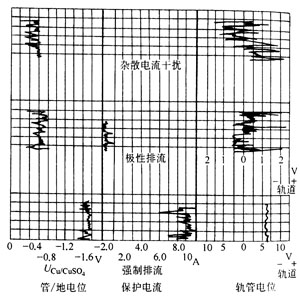 以上是一般規(guī)律。實(shí)際上雜散電流干擾源是多中心的。如礦區(qū)電機(jī)車軌道已形成網(wǎng)狀,供電所很多,當(dāng)多臺(tái)機(jī)車運(yùn)行時(shí)會(huì)產(chǎn)生雜亂無(wú)章的地下電流。作用在管道上的雜散電流干擾電位如圖10-61所示。