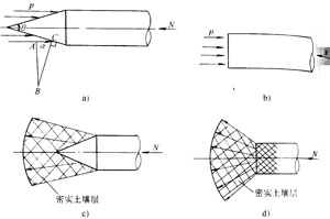 α角越大,P錐越小。而α角隨錐體頂頭錐度θ而變化,θ角越小,α角就越大。阻力就越小,因此錐體頂頭錐度角越小,阻力就越小。圖9-1c和d所示平頂和錐形頂頭擠壓土壤力的擴散情況,平頂擠壓擴散面大于維形頂頭擠壓擴散面。平頂頭不僅阻力大,而且由于擴散面大,往往容易造成地坪拱起。