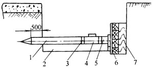 操作坑挖好后,坑底夯實,并在項管部位挖一深為500mm、直徑與操作坑相同的洞,用以定位。下一步,在后背墻處設置橫豎兩排枕木和一塊20~30mm厚鋼板,作為千斤,其他部件按圖9-2所示就位。