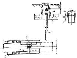 平面位置偏差的測定方法中,直接觀察法常用于短距離頂管的頂作坑上定出頂管軸線,過該軸線引2根鉛垂線至工作坑。在頂進管的頂端管斷面裝1個小燈泡,監(jiān)測者站在工作坑末端,用肉眼觀察。兩根鉛垂線和小燈泡應三點成一直線。如果發(fā)生位置偏移,觀察視線中小燈泡將會發(fā)生位移。此法雖不精確,但方法方便。見圖9-9。