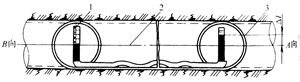 垂直方向偏差的測量可用水平儀,只測量最前一節(jié)管子的管底標高,或采用水柱連通器測定。如圖9-8所示。水柱連通器是利用在同一容器中液體壓力平衡原理制成。該方法是在頂進管道內(nèi)壁確定1條與管線相平行的直線為基準線,將水柱連通器液面線與該基準線的頂端和末端重合。如頂進管道發(fā)生垂直方向偏移,連通器兩端玻璃管內(nèi)的水平面,將會高出或低于基準線。