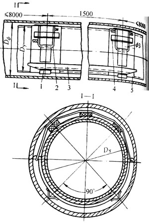 h.套管內(nèi)的燃氣管道安裝。安裝在套管內(nèi)的燃氣管道要采用特殊加強防腐蝕層。為了防止燃氣管道進入套管時損壞防腐層,燃氣管道安裝滾動支座或滑動支座。如圖9-10,滑動支座事先固定在燃氣管道,支座與燃氣管道之間墊橡膠板或油毛氈,防止移動燃氣管道時支座擦傷防腐層。支座間距按設(shè)計要求。支座的形式很多,但一定要保證支座與燃氣管道使用壽命相同,避免由于銹蝕等原因使支座損壞而使燃氣管道懸空、承受過大的彎曲應力。