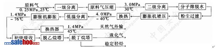 ??????????? 原料氣以0.20~0.30MPa、25℃進入生產分離器進行氣液分離,然后經壓縮機兩級增壓至3.0MPa、150℃后,經空冷器冷卻至50℃、水冷換熱器冷卻至30℃,以氣液混相狀態進入壓縮機出口分離器,分離出的凝液經節流降壓后輸至液烴分離器,脫水后的天然氣以2.5MPa、30℃進膨脹機增壓端增壓至4.0MPa、62℃,進水冷換熱器降溫至30℃后進入三股流換熱器,與初級吸收塔頂低溫外輸干氣及來自低溫分離器經節流降壓后的低溫液相換熱,降溫至-40℃進入低溫分離器。低溫分離器頂部氣相以4.0MPa、-40℃進入膨脹機降壓至1.3MPa、-80℃。低溫分離器底部液相以1.3MPa、-64℃進入三股流換熱升溫至25℃后去分餾裝置。經膨脹機膨脹制冷后的低溫氣體以1.3MPa、-80℃進入初級吸收塔頂部。脫乙烷塔塔頂氣以1.3MPa、0℃進初級吸收塔低部。初級吸收塔塔頂氣以1.3MPa、-80℃進三股流換熱器升溫至21℃,再與液化氣塔塔底輕油換熱升溫至32℃,作為合格產品外輸。初級吸收塔塔底液相進入脫乙烷塔頂部。