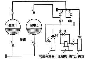 利用壓縮機倒罐,可將兩儲罐液相管接通,出液罐的氣相管接到壓縮機出口管路上,將進液儲罐的氣相接到壓縮機入口管路上,用壓縮機來抽吸進液儲罐的氣相壓力,經(jīng)壓縮加壓后送入出液儲罐,這樣在兩儲罐之間壓差的作用下,液化石油氣便由出液罐流往進液罐。