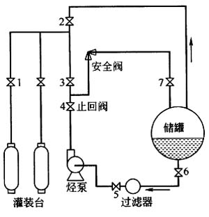 ②按烴泵操作規定開啟烴泵,當烴泵出口壓力達到1MP以上時,開啟閥門1向鋼瓶內注液。
