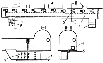 1-峒室入風(fēng);2-隔熱風(fēng)道;3-水泵給水管道4-水泵電機(jī);5-引風(fēng)管道;6-隔斷風(fēng)墻;7-風(fēng)流冷卻水幕;8-排水溝;9-峒室回風(fēng)