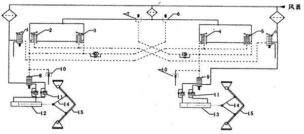 1-遠方風門復位閥;2-后風門外開關先導閥;3-后風門內開關先導閥;4-前風門內開關先導閥;5-前風門外開關先導閥;6、7-交叉閉鎖閥;8、9-終端執行風閥;10-截流閥;11-單向阻尼閥;12、13-風缸;15-風門