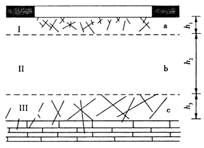 自20世紀80年代以來,多項突水機理的觀點先后問世,其中較為流行的觀點之一是“下三帶”理論?!跋氯龓А笔侵笍拿簩拥酌嬷梁畬禹斆娣譃椋孩竦装宀蓜悠茐膸Вǖ装鍖茐膸В﹉1;Ⅱ保護帶h2;Ⅲ承壓水導升帶h3,如圖1所示。