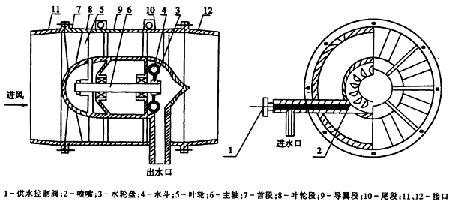 ??? 水力部通風機驅(qū)動采用水輪機原理,即壓力水通過噴嘴、沿著切線方向射向水輪機的水斗上,使水輪盤旋轉(zhuǎn)并帶動同軸另一端的軸流式葉輪旋轉(zhuǎn),并產(chǎn)生負壓,形成風流。