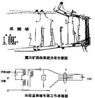 采掘場內接地保護系統,移動變電站到采掘場內用電設備,供電距離一般在1~2km, 采掘 場內用電設備為移動式的,其外殼無法就近與地面連接,通過電纜的地線將設備外殼與移動 變 電站接地線連在一起,形成完整的接地系統。但如何保證接地線的可靠連接,在黑岱溝露天 礦采用的地線監測保護,就可以保證地線的可靠聯接。