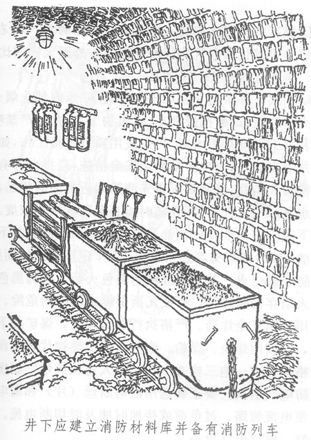 設置消防材料庫。為了迅速有效地撲滅礦井火災,每個礦井必須在井口附近設置消防材料庫;井下每個生產水平的主要運輸大巷中也應設置消防材料庫,儲備消防器材,并備有消防列車。滅火材料、工具的品種和數量必須滿足礦井滅火時的需要。滅火時消耗的材料和工具應及時補足。消防材料庫中的材料和工具,平時不準挪作他用。井下的火藥庫、充電硐室、水泵房和采區(qū)變電所中都要配備足夠的滅火器材。電氣火災和油料火災,不能用水撲滅,而應采用巖粉或砂子撲滅。發(fā)生電氣火災時,應首先拉閘斷電。