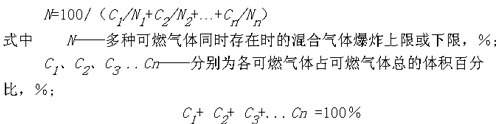 混合氣體中有兩種以上可燃?xì)怏w同時(shí)存在時(shí),其爆炸界限決定于各可燃?xì)怏w的爆炸界限和它們的濃度。可由公式求出:
