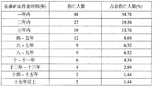 ????從表二可分析出:從事礦山作業(yè)一年內(nèi)(或剛?cè)氲V山人員傷亡人數(shù)為48人,占34.78%,死亡率較高,其次是二年內(nèi)礦齡內(nèi)的作業(yè)人員,隨著礦齡的增加,其死亡率在下降。究其原因,主要是新人礦山人員對適應(yīng)礦山采掘工作面作業(yè)環(huán)境、操作技能、自保安全常識較差。