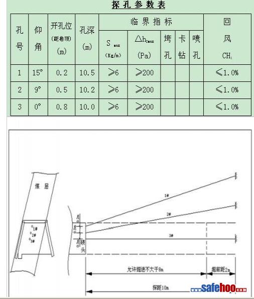 4、掘進前進行突出危險性預測時,其鉆孔布置3個,均布置在煤層軟分層中,沿煤層走向布置,孔深為10---10.5m,詳見鉆孔布置圖及參數表。經突出危險性預測不超標,保留鉆孔2m超前距掘進。