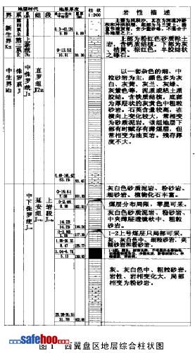 ???????地質構造基本形態為一單斜構造,地層走向為N W25o,傾向為S W65o ,傾角1-3o;斷裂不發育,褶曲表現為寬緩的坡狀起伏,局部煤層有沖刷,賦存條件極為簡單。含煤地層為中下侏羅統延安組。1 -2煤平均厚度為5.21 m。頂板屬較穩定型(11級11類頂板),直接頂為泥質砂巖和泥巖,水平層理,致密塊狀(51103綜采面切眼處直接頂厚度0.8-2.4 m) ;老頂為中砂巖和細砂巖,暗灰色,波狀層理,塊狀結構,見圖1。綜采工作面為傾斜長壁布置,工作面長240 m,推進長度3554 m。