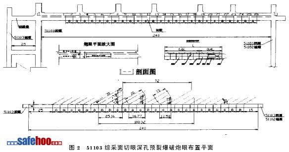 ??? 根據(jù)51103綜采工作面巖性和以前兩個(gè)綜采工作面的初放經(jīng)驗(yàn),51103綜采面深孔預(yù)裂爆破進(jìn)行了如下改進(jìn):①將預(yù)裂爆破孔由原來的20個(gè)孔增加為26個(gè)孔,切眼爆破長(zhǎng)度由原來的192.58m增加為212.32m,并將炮眼中心線由距切眼副幫側(cè)2.5m改進(jìn)為2.6 m;②改變預(yù)裂爆破孔深度,由原來統(tǒng)一孔深15m改變?yōu)?個(gè)孔深30m和4個(gè)孔深20m,其余18個(gè)孔深仍為15 m;③改進(jìn)封口方式,將原來炮眼封口采用圓臺(tái)形木塞改進(jìn)為圓臺(tái)倒楔形木塞,提高了炮泥的密封效果,增強(qiáng)了爆破效果;④改進(jìn)了炮眼起爆順序,由于炮眼數(shù)量和裝藥量增加,為保證爆破安全性,由原來兩段順序起爆變?yōu)槿雾樞蚱鸨?br />