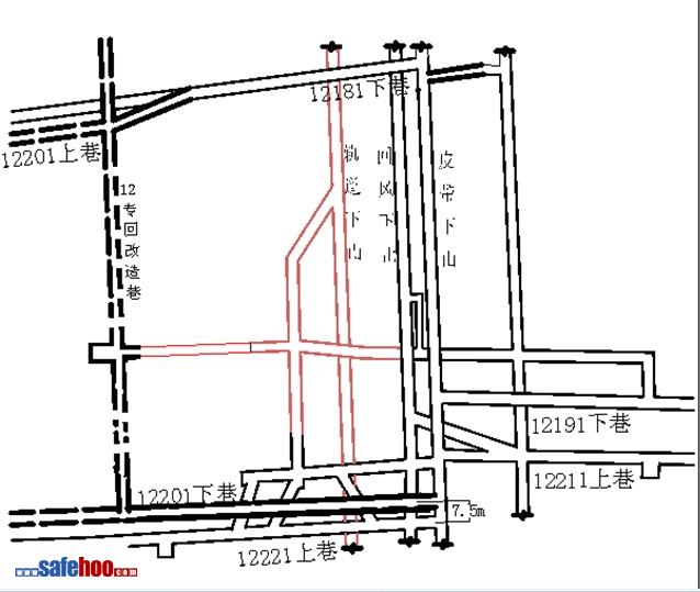8、貫通后,通風(fēng)部門要在12201下巷外段標(biāo)出永久風(fēng)門的位置,開三隊根據(jù)生產(chǎn)科安排在建風(fēng)門處進行修棚,然后由通風(fēng)隊建造永久風(fēng)門。