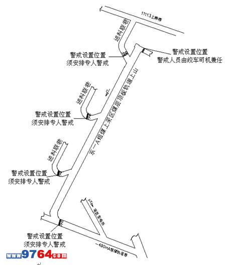 6、斜巷打運過程中要嚴格執行“行人不行車,行車不行人”的封閉式打運,打運過程中要安排專人在各斜巷入口處安排專人警戒。需要設立警戒的位置如下圖所示。