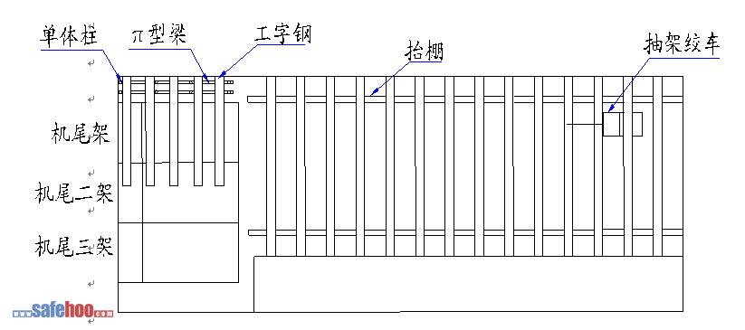 4、抽架前,必須準備好必要的工具及材料,包括4臺5噸葫蘆.圓木.單體柱等。