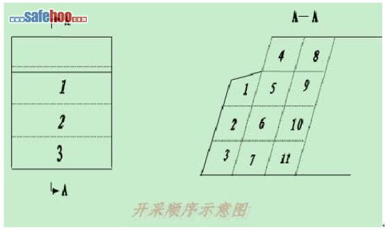 在自然山坡或原有的巖面及設(shè)備條件下,遵循“采剝并舉,剝離先行”的原則。將采剝作業(yè)面,沿巖面走向方向劃分為一定厚度的豎條帶,即采掘帶。如果采掘帶長(zhǎng)度較大及有必要,可沿巖面傾向方向把配置獨(dú)立采掘運(yùn)輸設(shè)備的范圍定為采區(qū)。采用高階段小分層,坡面上允許只有一個(gè)臺(tái)階,開(kāi)采順序始終自上而下,宜采用傾斜眼,一次布置2-4排炮眼,合理布置炮眼并確定適宜的裝藥量和裝藥結(jié)構(gòu)。采用毫秒延時(shí)雷管,使布置在同一平臺(tái)的所有炮眼一次同時(shí)起爆,直接把巖面巖石一次性掀到巖底,減小高差運(yùn)輸,并形成規(guī)則的安全臺(tái)階。當(dāng)進(jìn)行第二次鉆爆作業(yè)時(shí),作業(yè)人員已在一定寬度的規(guī)則的安全臺(tái)階上進(jìn)行作業(yè)。這種開(kāi)采方法開(kāi)拓工程量小,操作技術(shù)較簡(jiǎn)單,露天礦山均可采用。 開(kāi)采順序:自上而下,從前而后。如圖示
