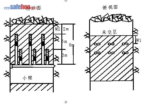 4.3.4架設防護柱采用高于小眼底0.5m處橫放二到三根柱子,出煤側并排豎放2根柱子,高度、寬度視小眼斷面而定,扒煤口的斷面為小眼斷面三分之一。