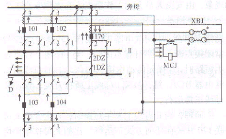 當旁路兼母聯170開關在第一種方式下運行時,刀閘2DZ閉合,刀閘1DZ斷開,2DZ刀閘的常開輔助接點閉合,中間繼電器1ZJ動作,轉換接點1ZJ2常閉接點斷開、常開接點閉合。當I母線上D點發生短路時,選擇元件動作接點JJ1閉合,I母線出口繼電器BCJ動作,跳開故障I母線上所接開關,保證Ⅱ母線正常運行。