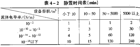 (5)設備在罐裝、循環或攪拌等操作中禁止進行取樣、檢尺或測溫等現場操作。在設備停止運行后,仍需靜置一段時間才允許進行上述操作。所需靜置時間見表4—2。對鐵路槽車油罐車則需靜置2min以上。對金屬材質制作的取樣器、測溫器及檢尺等在操作中應與大地進行聯接(可用導靜電繩索與已接地的構件相接)。有條件時應采用自身具有防靜電性能的工具。(6)當在烴類流體中加入抗靜電添加劑來消除靜電時,應注意其容器應是導電的并可靠接地,還需定期檢測其電導率,以便保持在規定要求以上。